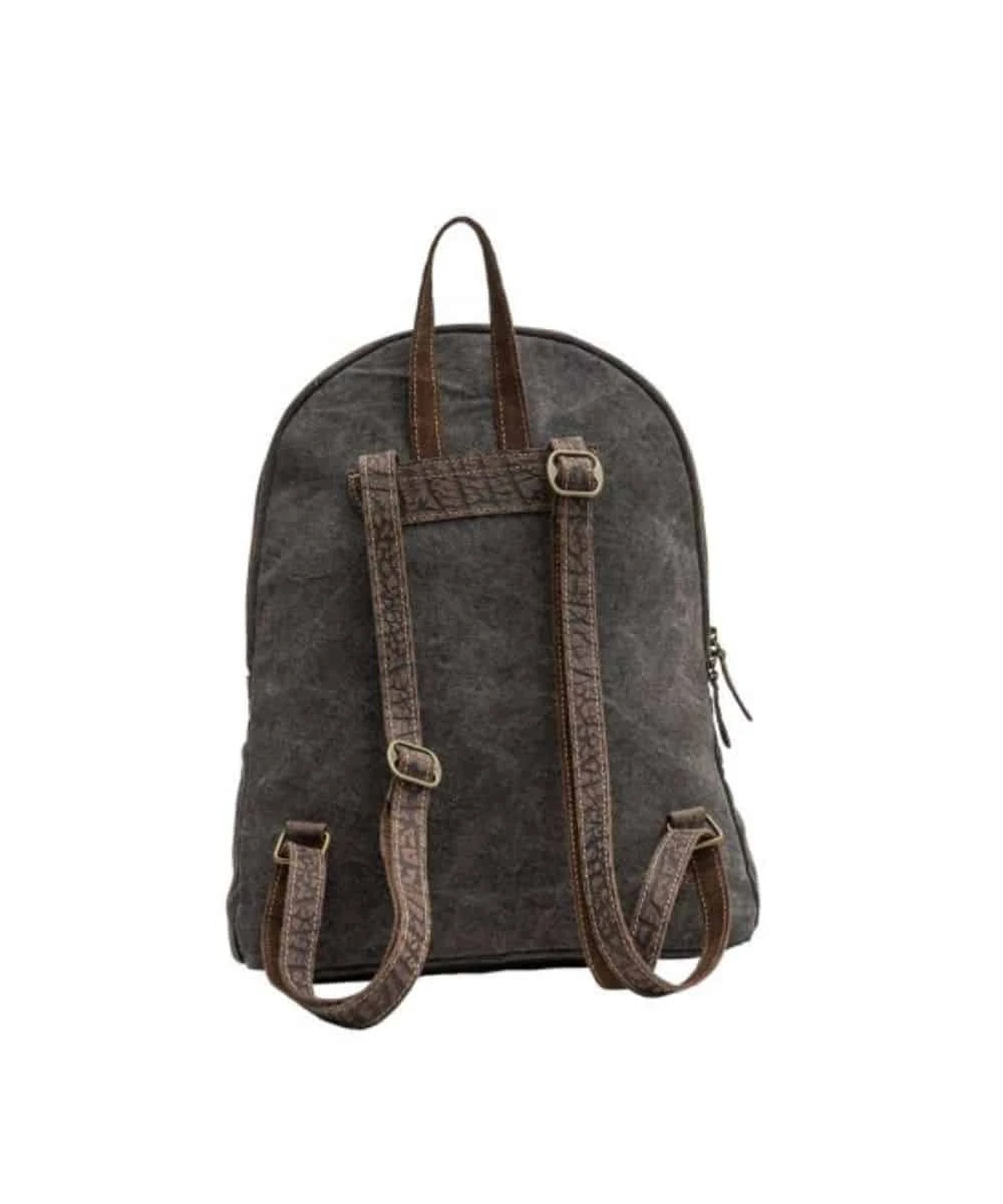 Canvas, Leather, And Rug Material; Leather On Top Front; Navajo Print On Rug Material On Bottom Front; Tassel Zipper Pocket On Front; Whipstitching Along Both Sides Of Zipper; 1 Interior Zipper Pocket; 2 Interior Open Pockets; Back Is Canvas With Adjustable Leather Straps; 3″ Handle On Top; Measures Approximately: 4″D x 13″W x 15″H; Style #S-6796