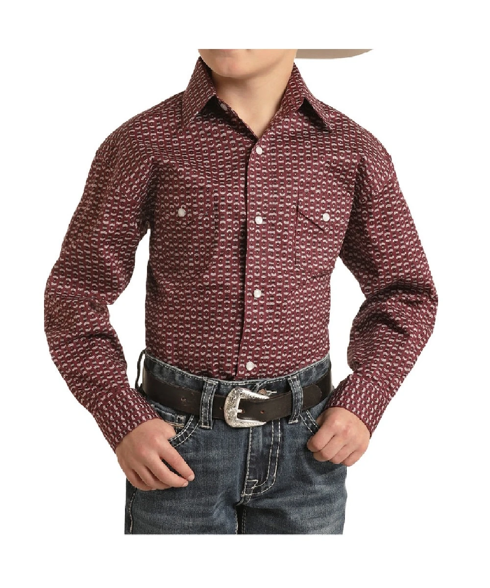 97% Cotton/3% Spandex; Stockyard Style; Long Sleeve; Pearl Snap Closure; Spread Collar; Two Front Chest Snap Pockets; Snap Cuffs; Burgundy Geo Print; Style #RSBSOSR0EZ