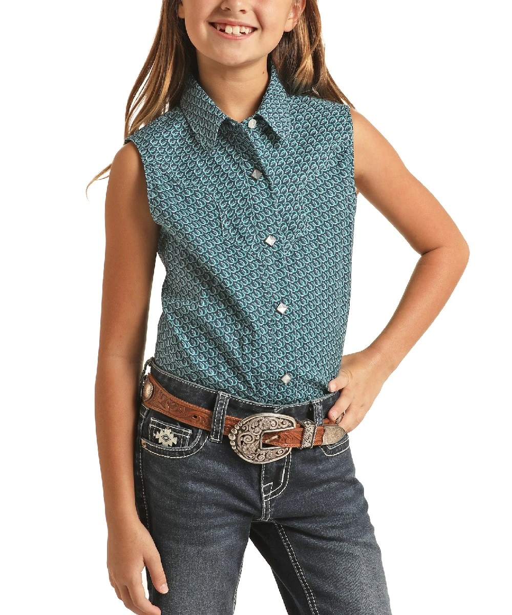 97% Cotton/3% Spandex; Spread Collar; Sleeveless Styling; Western Design Yokes; Diamond Shape Pearl Snaps; Color: Black And Turquoise Horseshoe Print Design; Style #RRGSSSRZ80