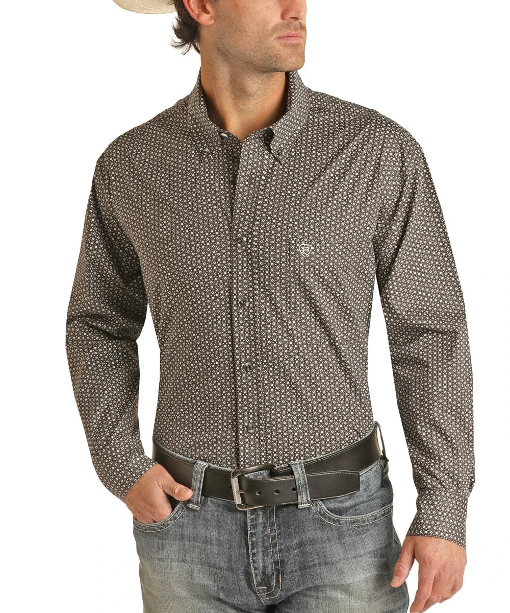 100% Cotton; Long Sleeve; Button Down Collar; Button Front And Cuffs; Single Open Chest Pocket With Logo Embroidery; White Geometric Print; Color: Black; Style #RRMSODRZ7F