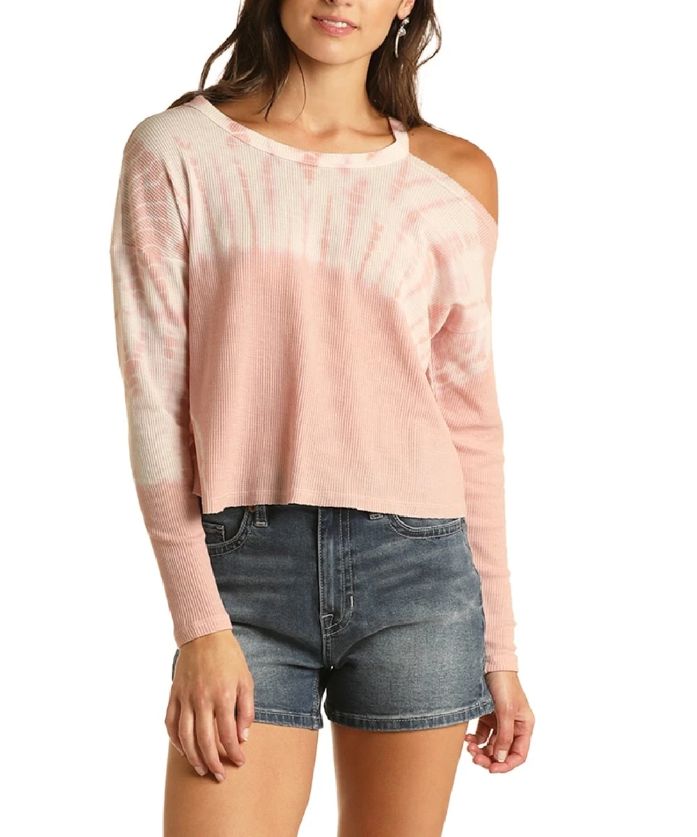 655 Polyester/35% Cotton; Waffle Knit; Long Sleeve; Open Left Shoulder; Color: Pink Tie Dye; Style #48T3051