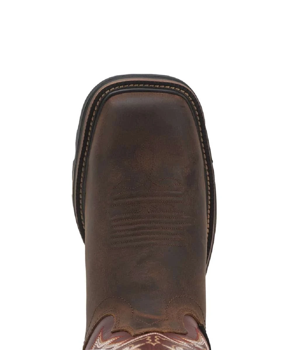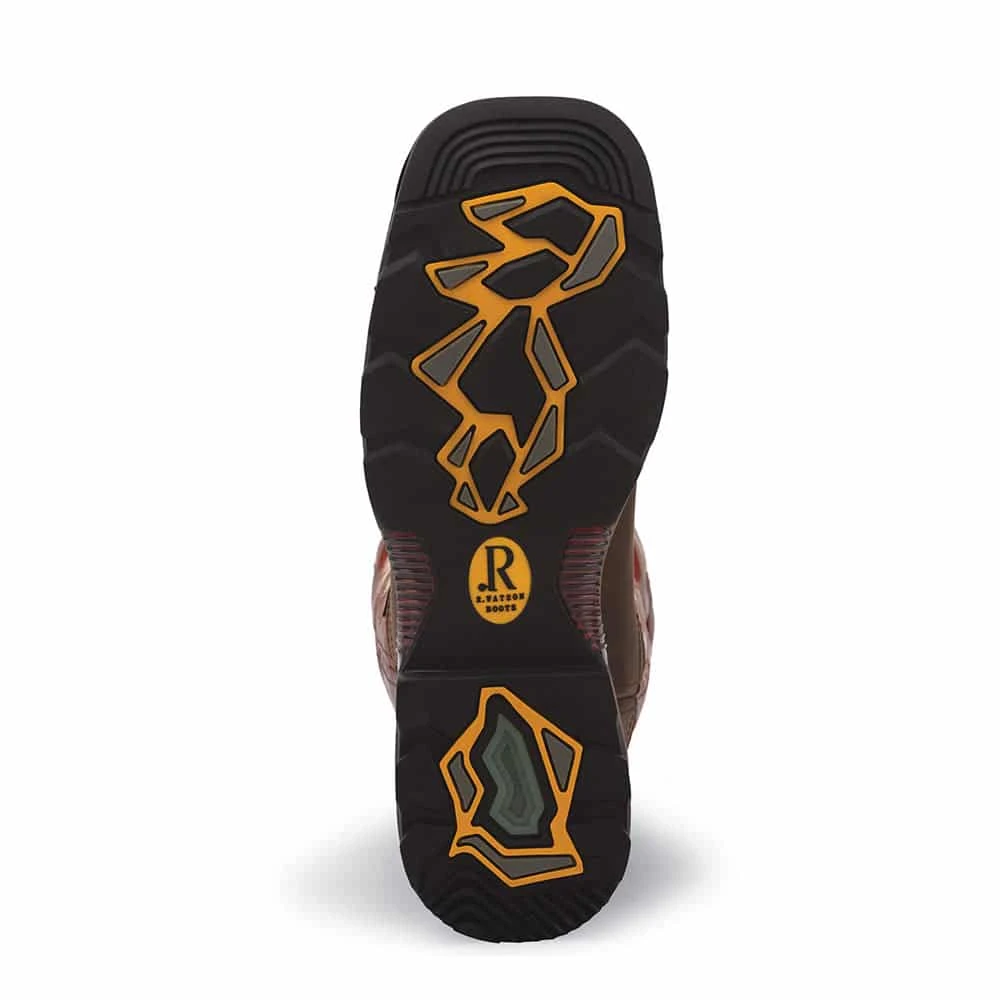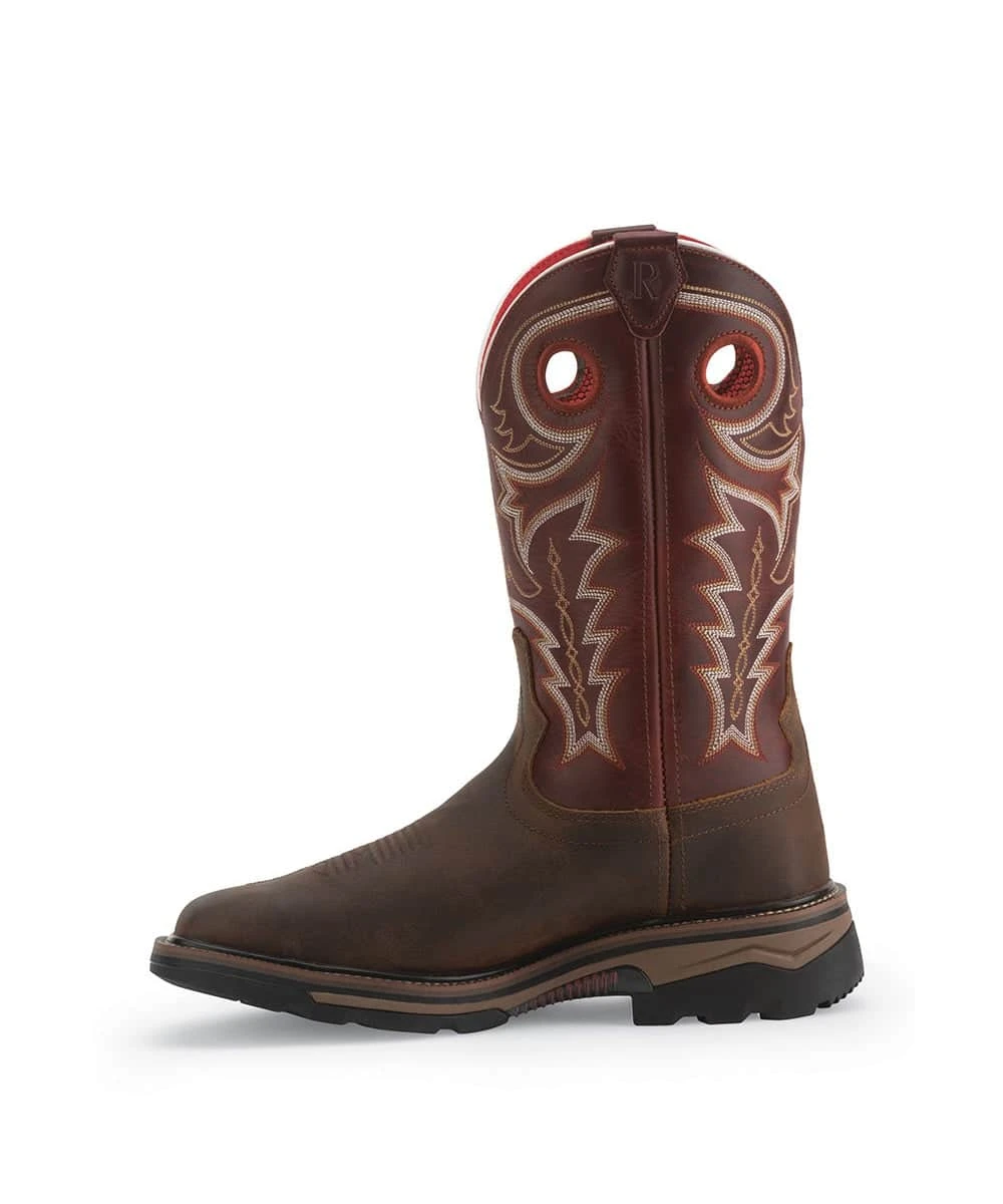 12″ Boot; Cowhide Leather; Cherry Red Shaft/Adobe Brown Buffalo Foot; Ten Row Shaft Stitching; Removable Orthotic Insole; EVA Midsole; Block Heel; Square Toe; Slip And Oil Resistant Outsole; Electrical Hazard Rated; Style #RW1002