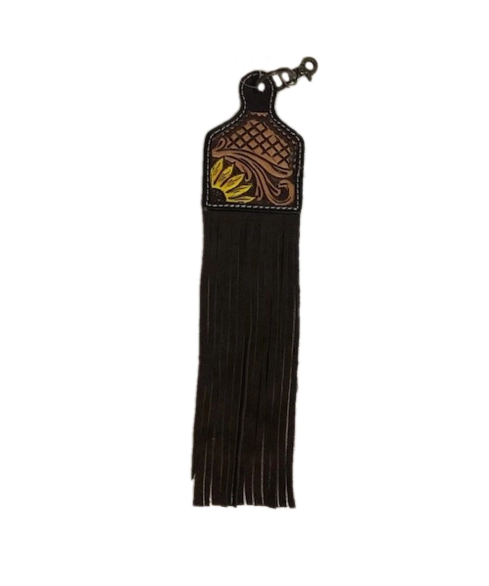 Hand Tooled Sunflower Design; Hand Painted; Fringe At Bottom; Can Be Used As A Key Chain Or Saddle Charm; Total Approximate Length 13.5″; Style #SC104