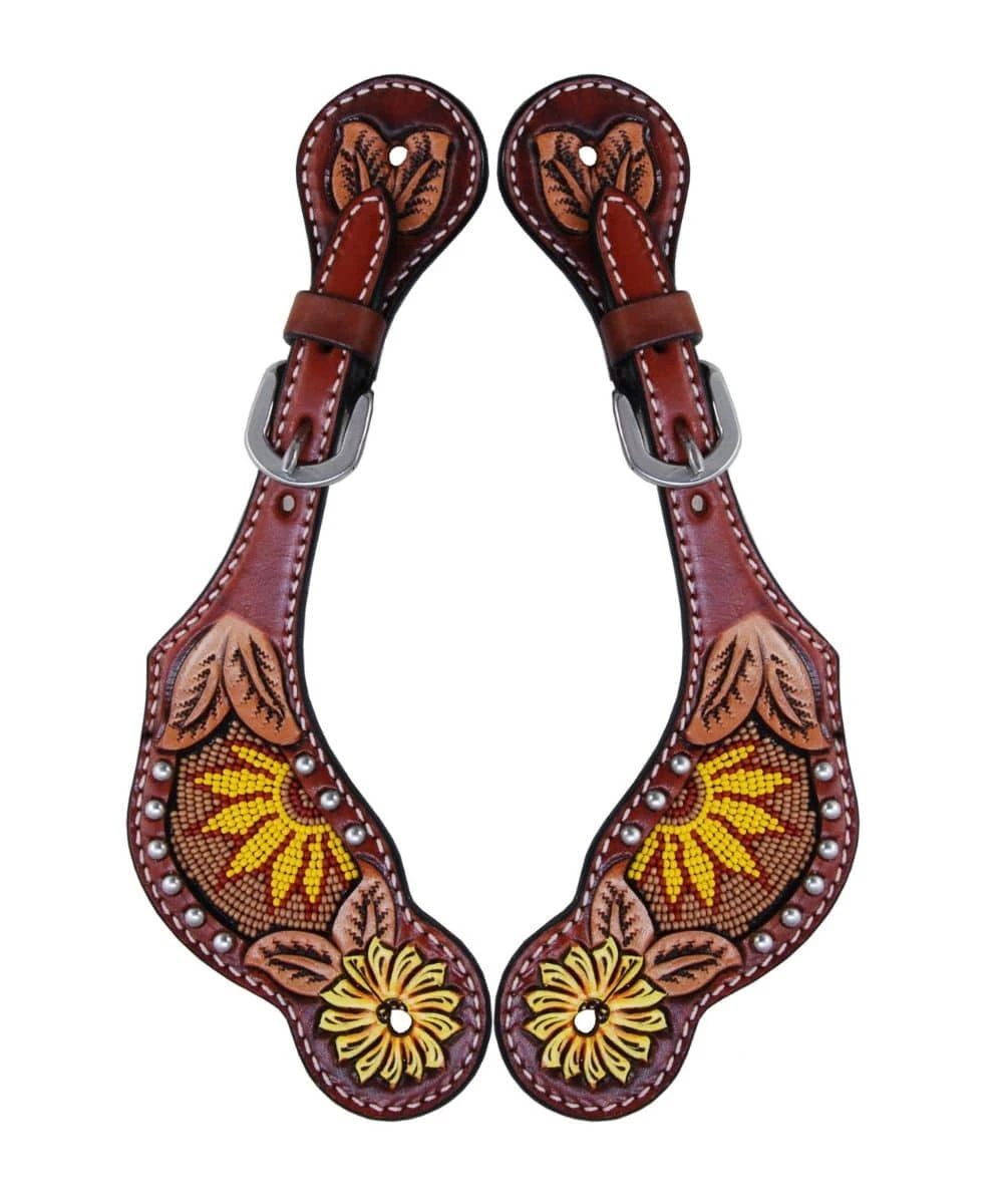 Leather; Painted Floral Tooled Leather With Beaded Sunflower Design; White Stitching; Silver Studs Around Beading; Adjustable; Style #SS495