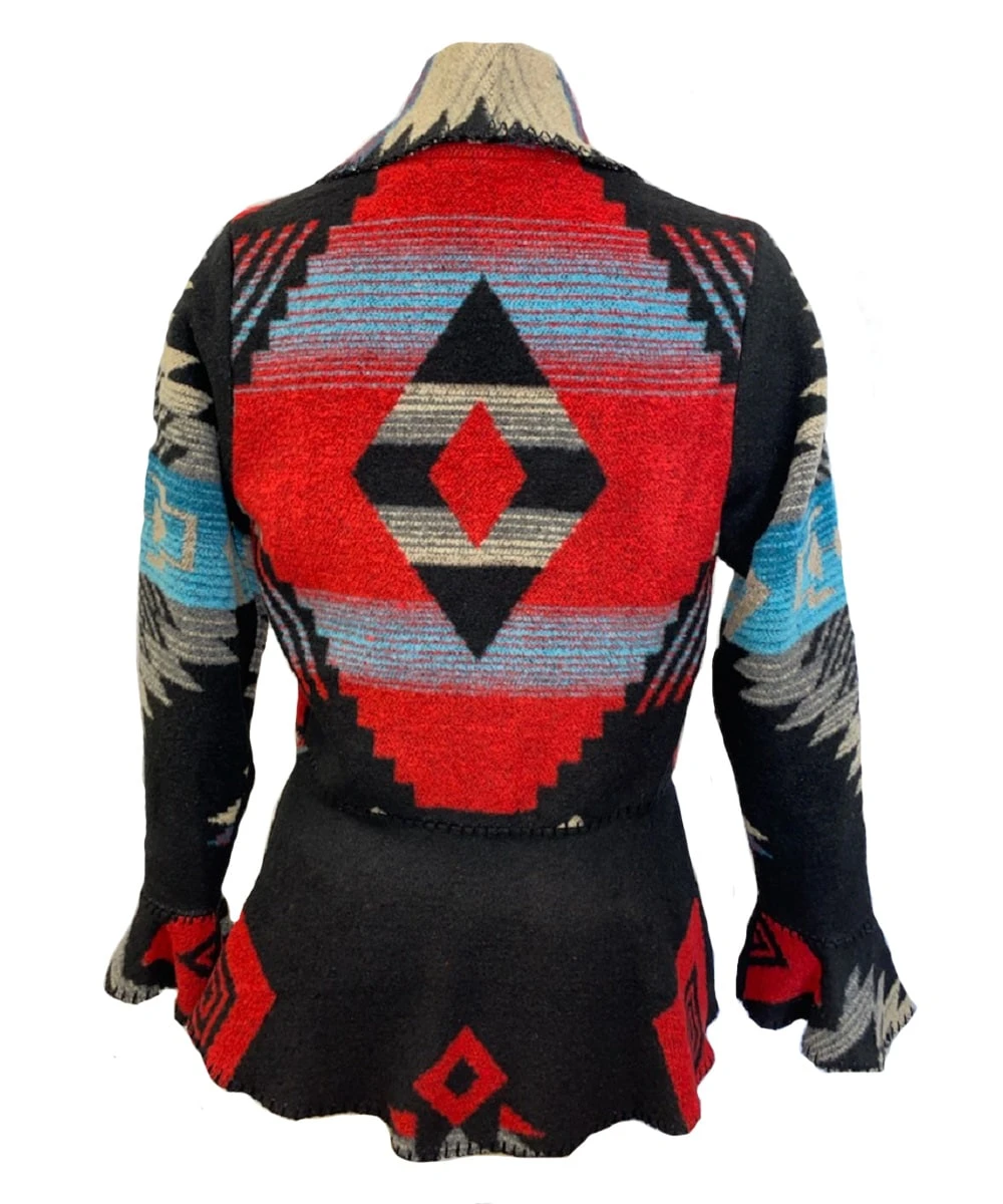 20% Wool/50% Acrylic/25% Polyester/5% O.F.; Unlined; Fitted Waist With Silver Concho Loop Closure; Flounce Peplum On Sleeves And Jacket Bottom; Blanketstitch Trim Finish; Multi Color Southwestern Print; Color: Dakota; Style #845DK