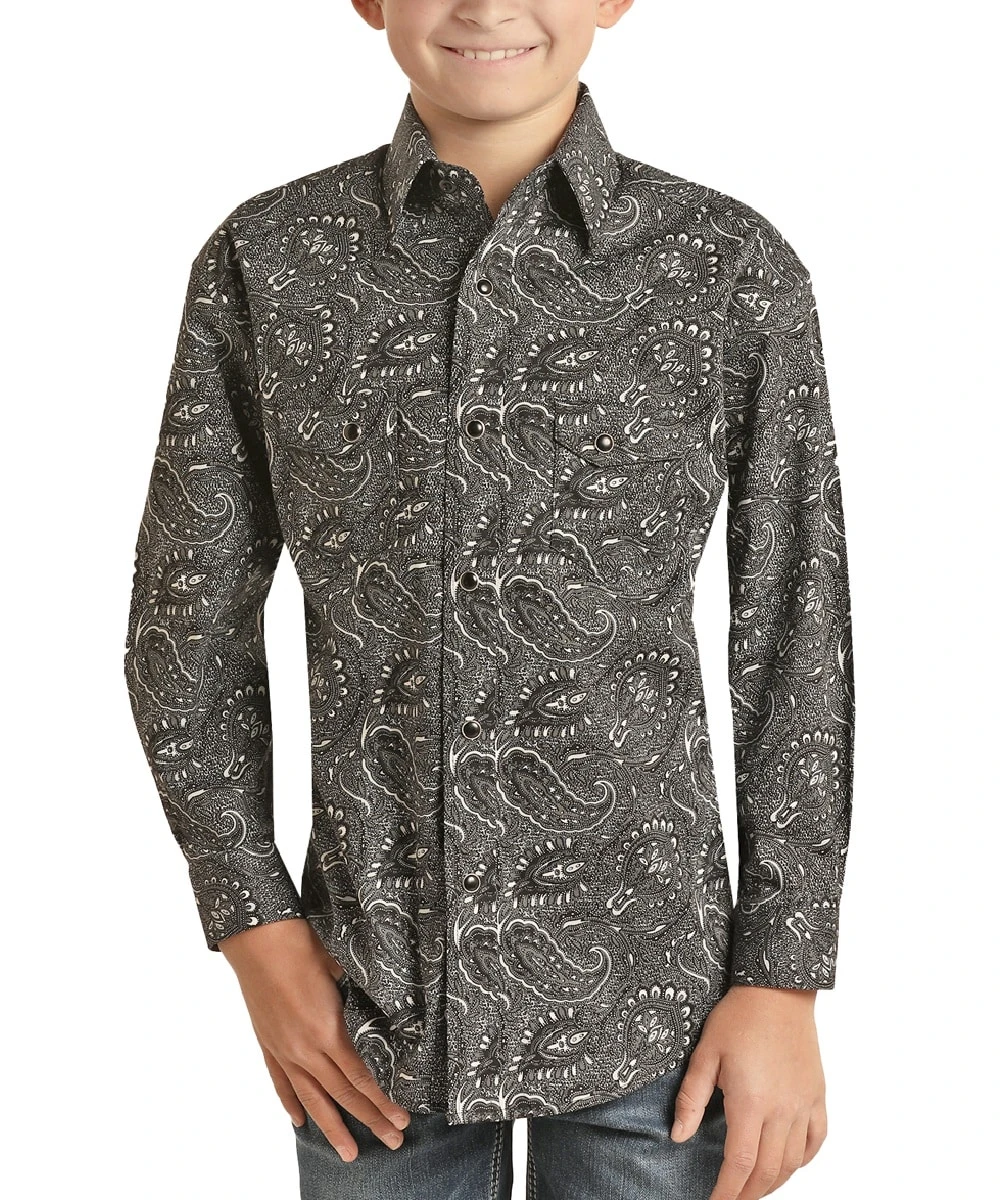 Long Sleeve; Spread Collar; Black Snaps; Snap Front And Cuffs; Two Snap Flap Chest Pockets; Single Point Front Yokes; Paisley Print; Color: Black; Style #RRBSOSR08Z