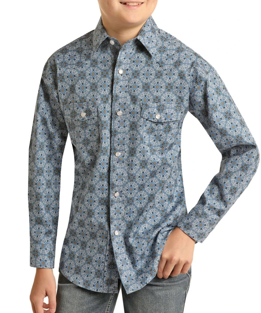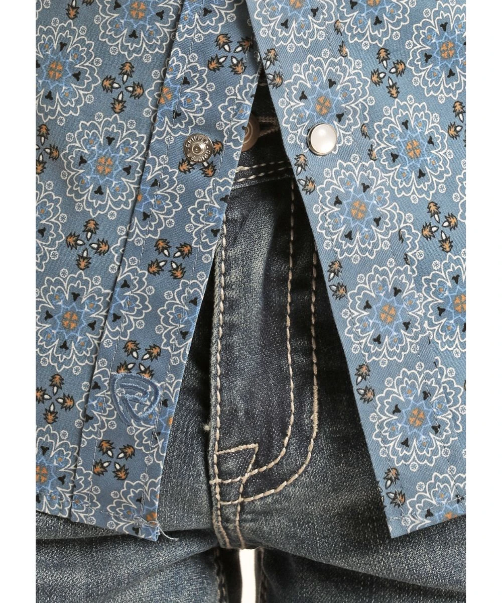 Long Sleeve; Spread Collar; Dual Snap Flap Chest Pockets; Single Point Front And Back Yokes; Color: Blue Medallion Geo Print; Style #RRBSOSR0QV