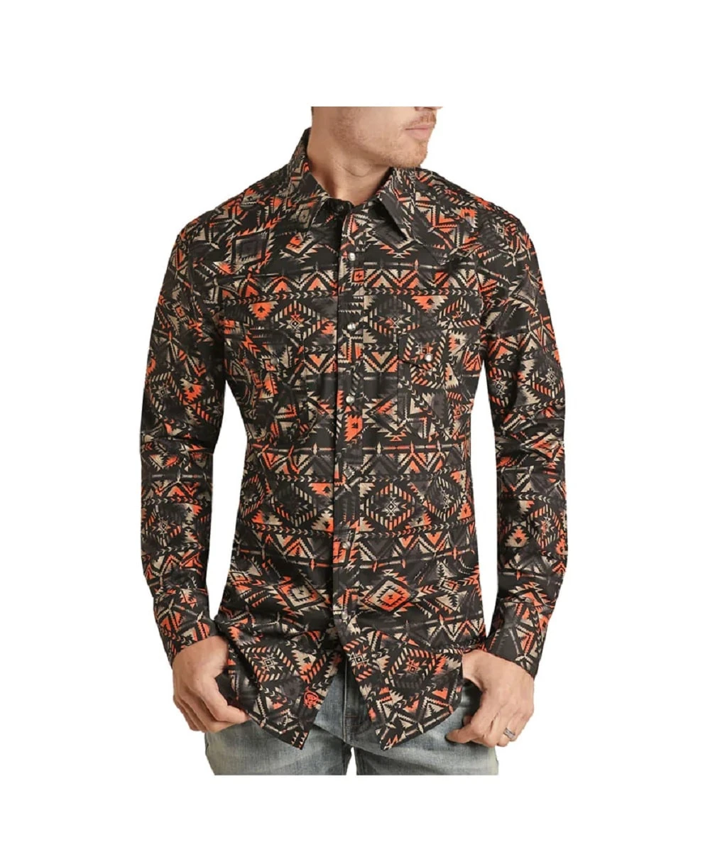 97% Cotton/3% Spandex; Long Sleeve; Spread Collar; Snap Placket; Two Snap Flap Chest Pockets; Single Point Front Yokes; Aztec Print; Color: Black/Gray/Orange; Style #RRMSOSR08S