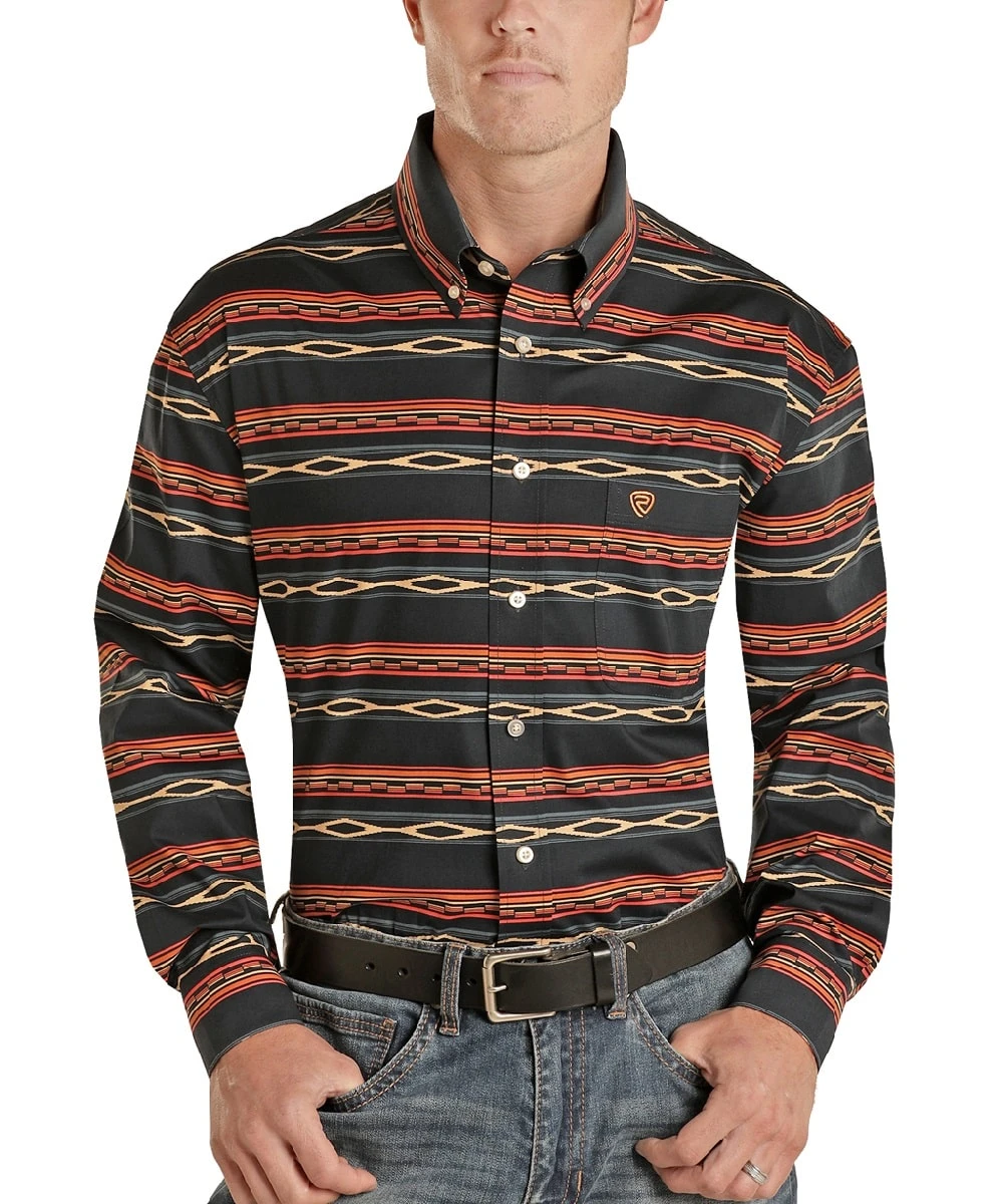 Long Sleeve; Button Down Collar, Front And Cuffs; Single Open Chest Pocket With Logo Embroidery; Multi Color Aztec Stripe Print; Color: Black; Style #RRMSODR08U
