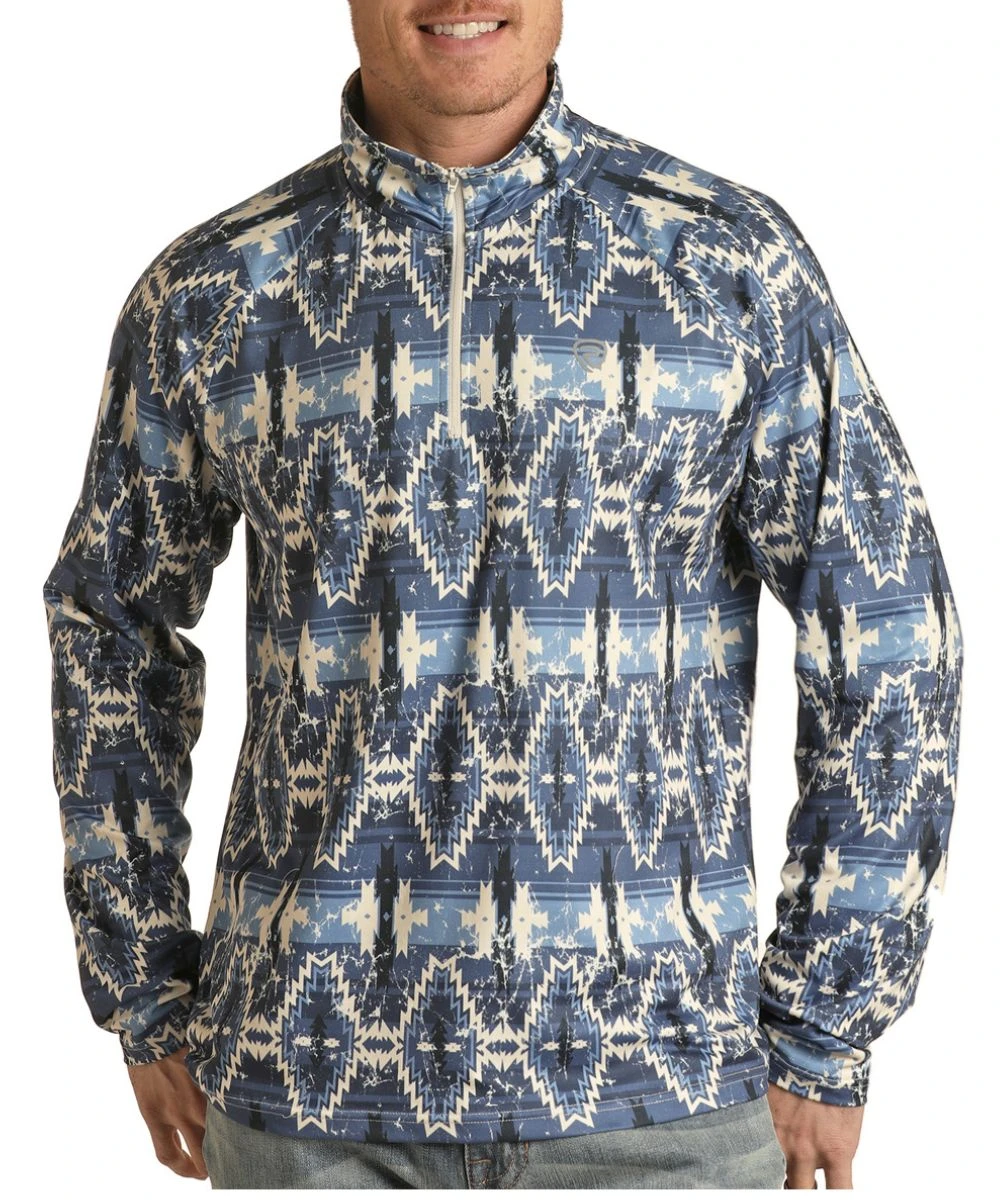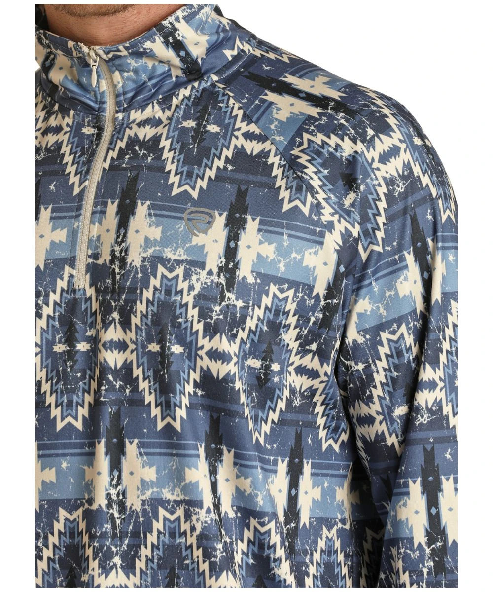 88% Polyester/12% Spandex; Long Sleeve; Mandarin Collar; 1/4 Zip Closure; Performance Made; Ultra Lightweight; Soft And Stretchy; Color: Blue And Tan Aztec Print; Style #RRMT91R0JI