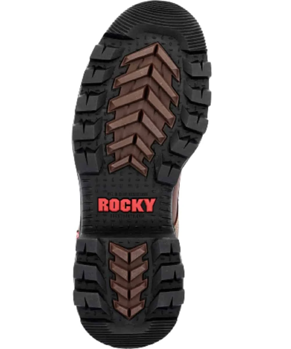 9″ Shaft; Waterproof Full Grain Leather; Removable Brush Guard Kiltie; Fiberglass Shank; Rocky Rebound Cushioning Technology; EnergyBed LX Footbed With Memory Foam; 2″ Heel Height; Composite Toe; Flexible Direct Attached PU Midsole; Oil And Slip Resisting Rubber Outsole; Meets Standards For ASTM F2413 Protective Toe And ASTM F2413 Electrical Hazard; One Year Vapor Pass Breathable Recycled Membrane Waterproofing; Color: Brown; Style #RKK0397