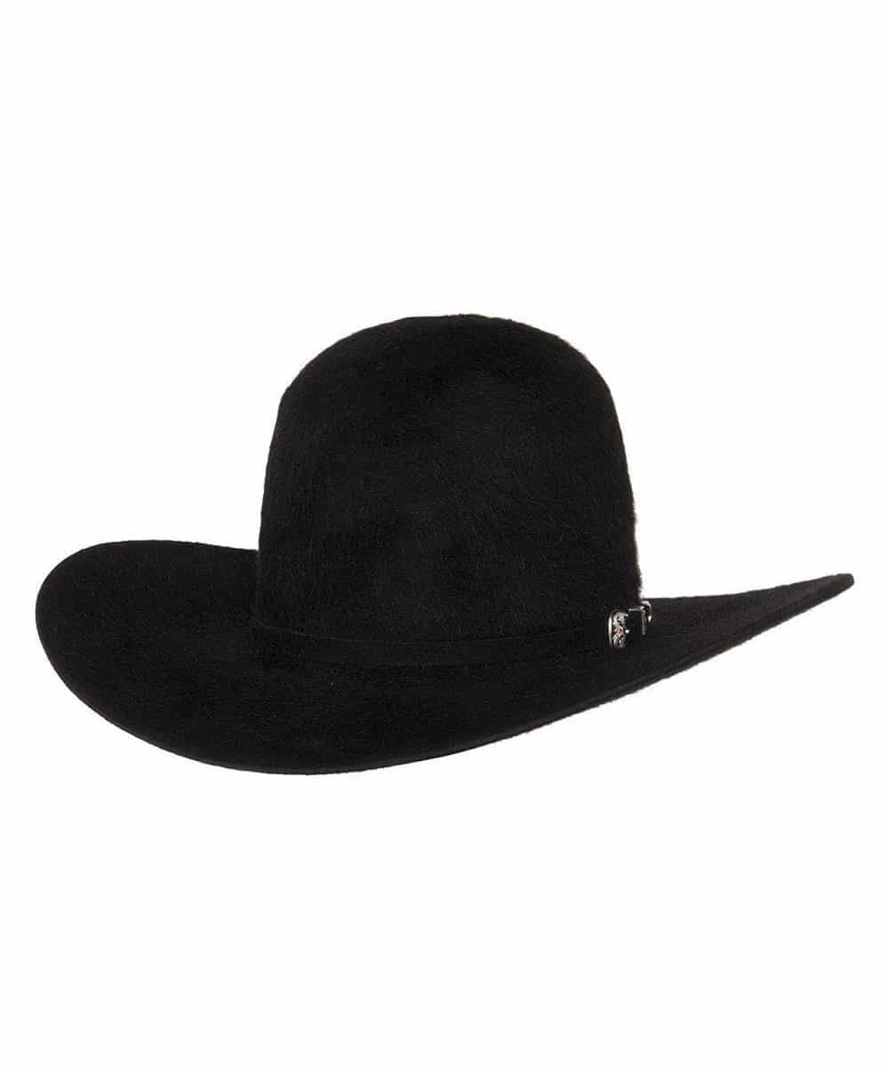 10X; 4 1/4″ Brim; Open Crown; Self Hat Band With Three Piece Silver Buckle Set; Color: Black; Style #10XOPEN 41/4 GRIZZLEY