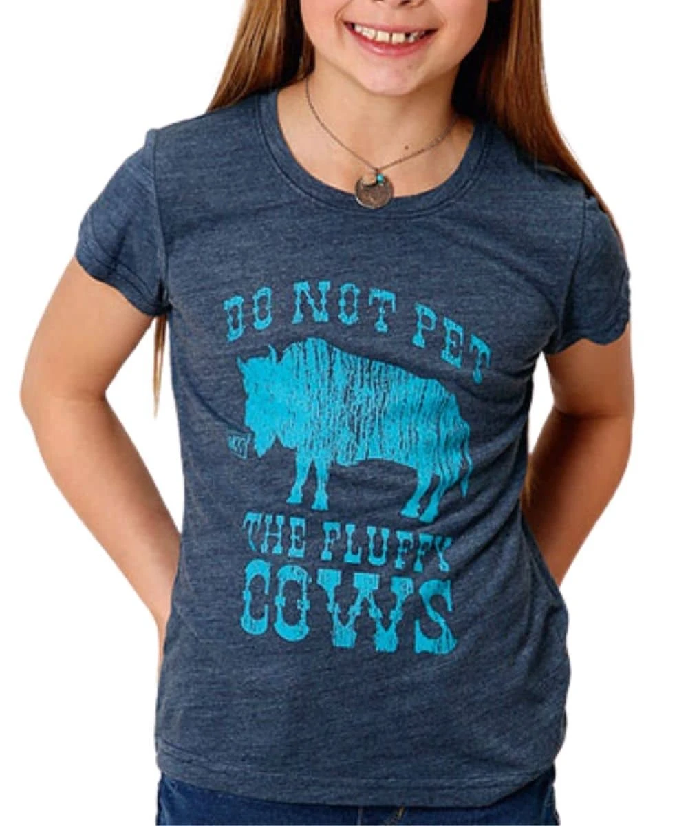 65% Polyester/35% Rayon; Jersey Knit Short Sleeve Tee; Scoop Neckline; Screen Printed Front Graphic Reads “Do Not Pet The Fluffy Cows”; Color: Blue; Style #03-009-0514-2050