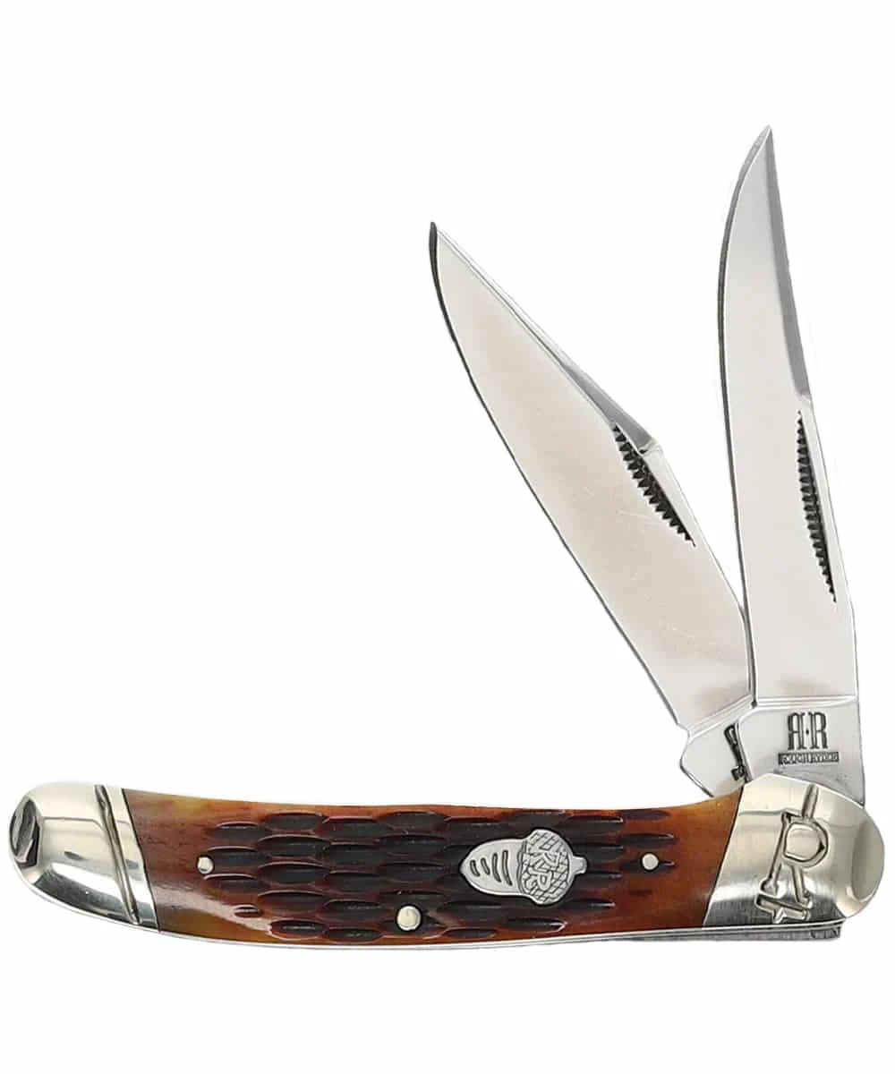 440A Stainless Steel Blades; Mirror Polished Finish; Match Strike Pulls; Amber Jigged Bone Handles; Brass Liners; Nickel Silver Acorn Shield; Nickel Silver Pins And “Slanted R” Bolsters; 2.625″ Clip Point And Modified Clip Point Blades; 1/16″ Thick; 3.75″ Closed; Weighs 4 Ounces; Style #RR2289