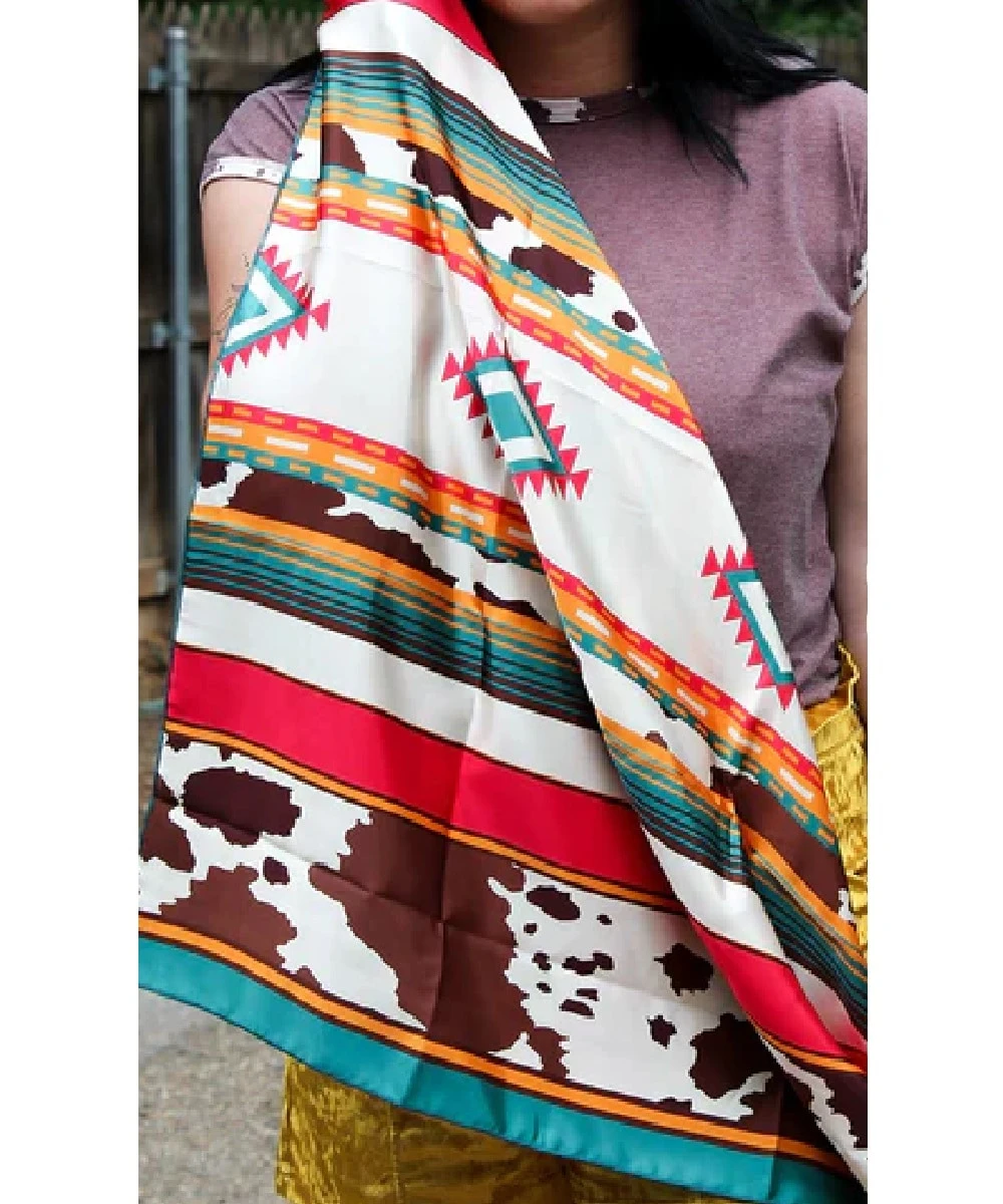 100% Polyester; Teal, Orange, Brown, Red And White Aztec Print And Brown And White Cow Print Design; Measures Approximately 36″ x 36″; Style #CONROE COWPRINT WILDRAG