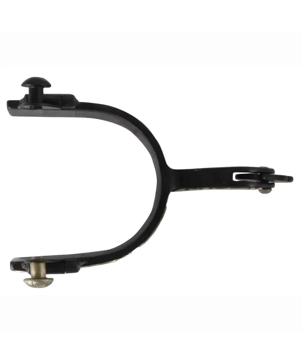 Black Steel Spur With Silver Plate Filigree Overlay On Band And Neck; Black Steel With Rust Over Time Leaving A Beautiful Antique Finish; 1″ Band Width; 2″ Neck Length; Cloverleaf Rowel; Color: Black/Silver; Style #SB35975