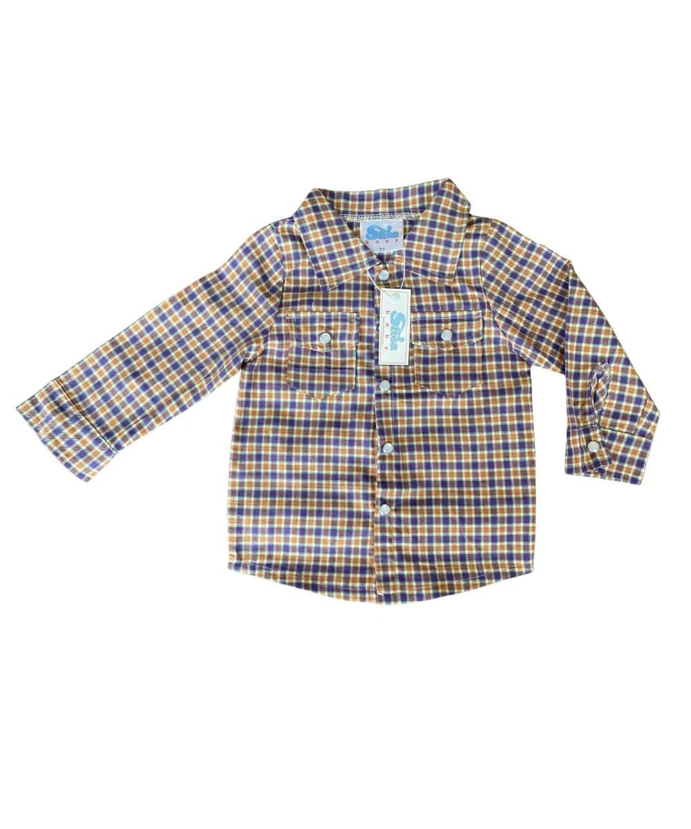 95% Polyester/ 5% Spandex; Color: Purple Plaid; Spread Collar; Double Chest Pockets With Pearl Snap Closure; Pearl Snap Button Down; Long Sleeves; Pearl Snap Cuffs; Style #BPL05