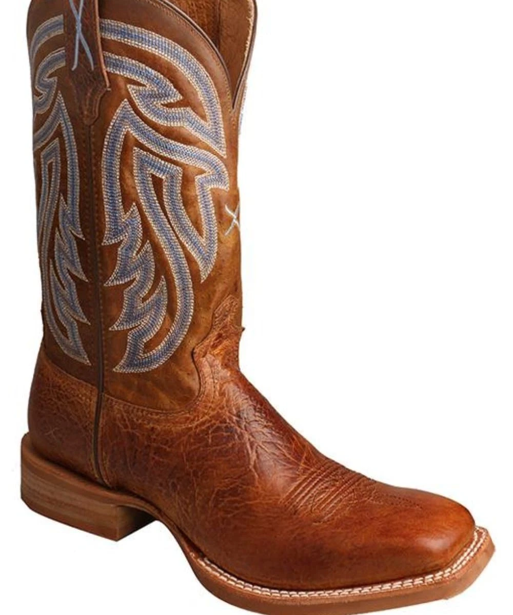 Rancher Collection; 12″ Shaft; Color: Peanut; Multi Row Blue And White Stitching Design On Shaft; Stitched Logo On Pull Straps; Double Stitch Welt; Wide Square Toe; Genuine Super Slab Rubber Outsole With Horseshoe, Twisted X Logo And Skeleton Cowboy On Bottom Of Boot; Style #MRA0001