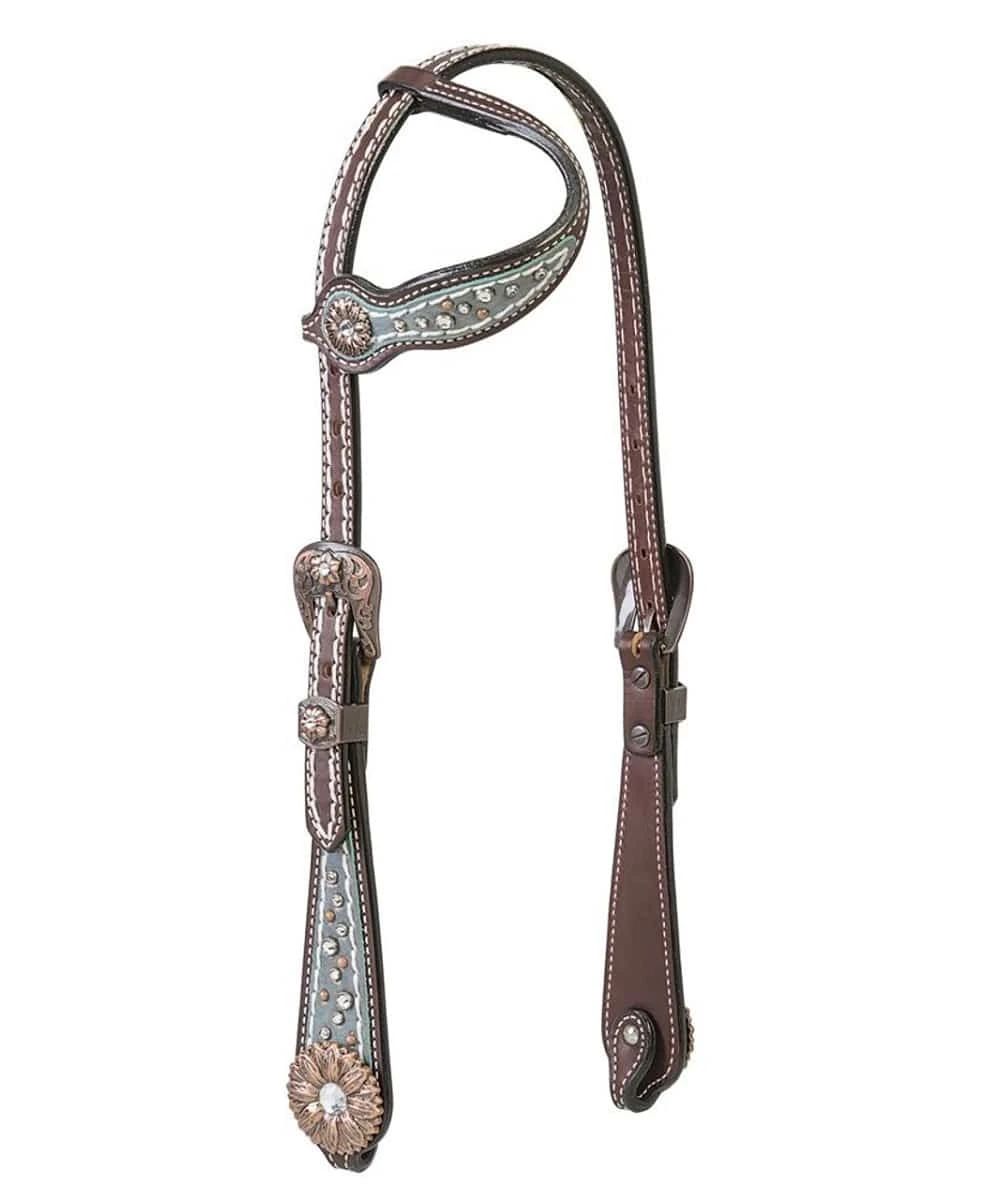 Rich Brown Premium English Bridle Leather; Extra Wide Sliding Ear And Cheeks; Copper Metallic Turquoise Leather Overlays; Clear Crystals And Etched Copper Spots Add Gleaming Style; Denim-Inspired White Stitching; Antique Copper Flower Conchos And Buckles; Horse Size; Style #10-0421