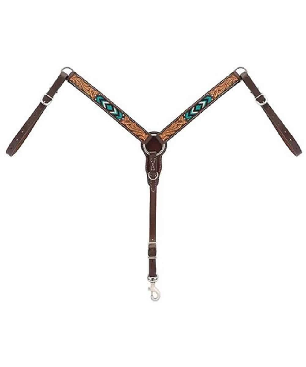Dark Oiled Leather; Carved Floral Accents Highlighted With Tan Stain; Turquoise Diamond Beaded Inlays And Stainless Steel Spots; Non-Rust Stainless Steel Hardware; 1-1/4″ Pony Size; Style #45-0328