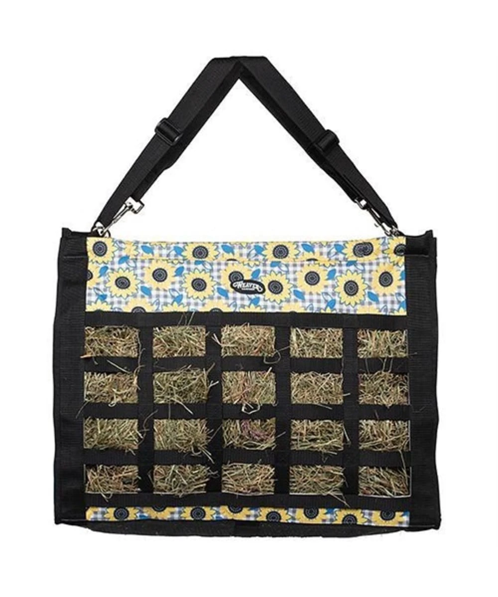 600 Denier Polyester; Top Loading Hay Bag Features A Slow Feed Design That Promotes Slower Feed Consumption For Better Digestion; Square Openings For Slow Feed Method Helps Alleviate Boredom As Well As Reduce Hay Costs; Great For Use In Stalls And Trailers; Easy Hang From Two Adjustable, Detachable Straps And Hold Two Average Size Flakes Of Hay; Mesh Bottom For Ventilation; Hole Size Approximately: 3″ L x 2″ W; Size Approximately: 18.5″ L x 25″ W With 11.5″ Opening At Top For Fill; Color: Sunflower Pattern/Black; Style #35-1381-236