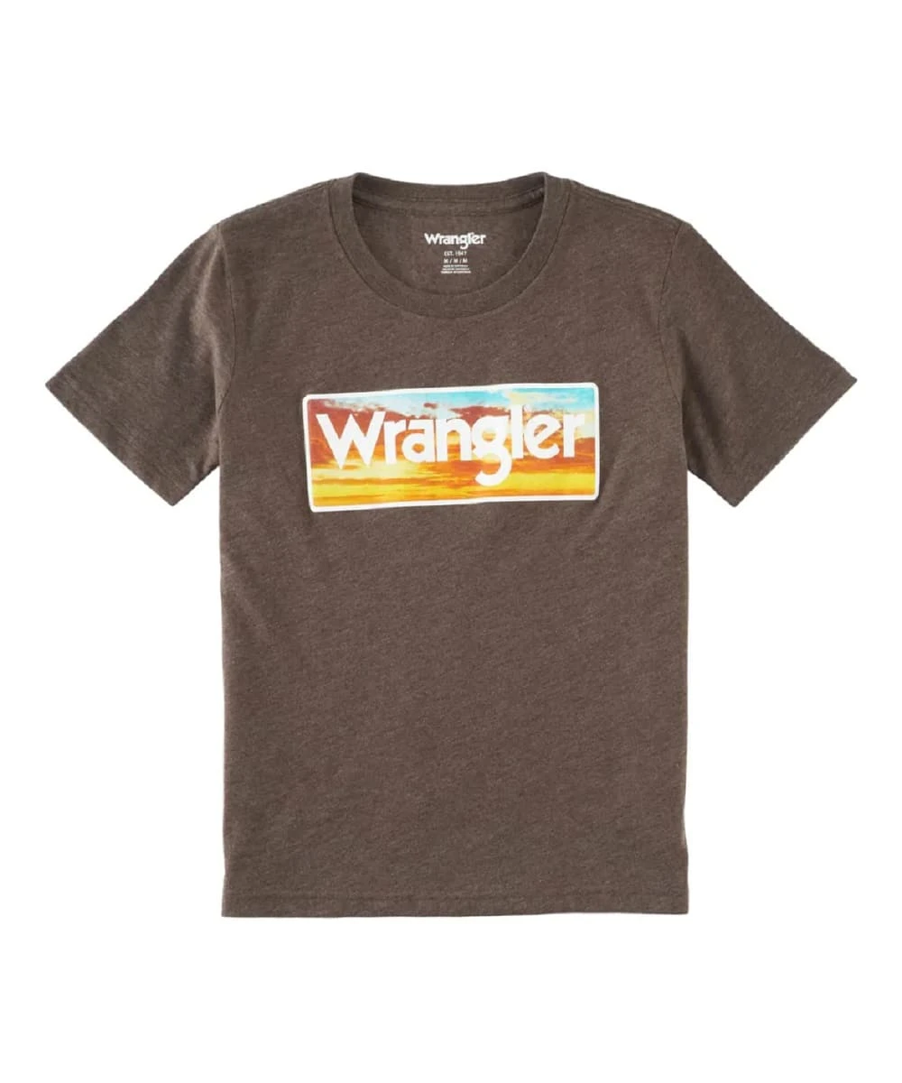 50% Cotton/50% Polyester; Ribbed Crewneck; Short Sleeve; Relaxed Fit; Rectangle Sunset Graphic Printed On Front; White Logo; Color: Brown Heather; Style #112319269
