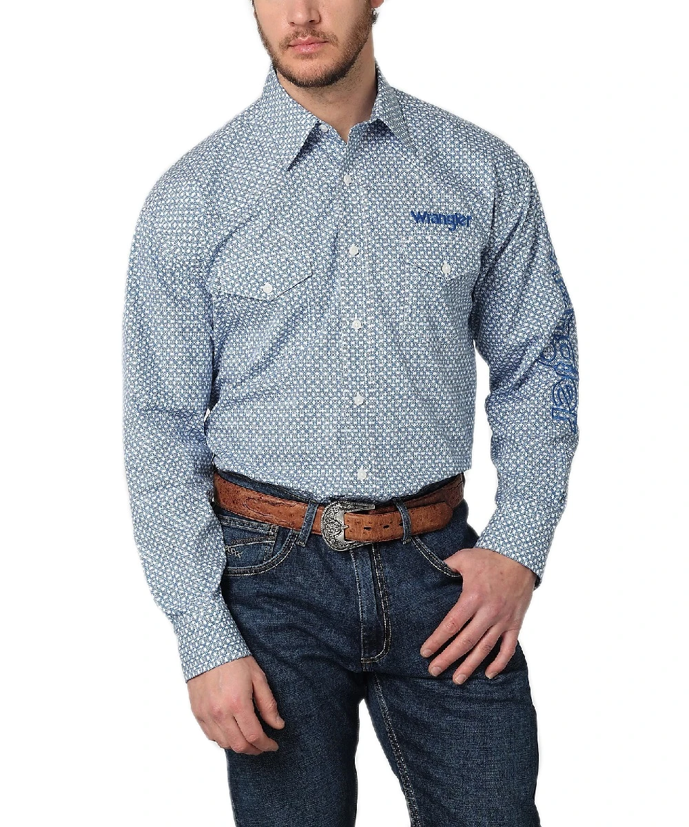 100% Cotton; Long Sleeve; Spread Collar; Button Cuffs; Two Button Through Pockets, With Pencil Slot In Left Pocket; Single Point Front And Back Yokes; Embroidered Blue Wrangler On Chest, Left Arm And Back; Color: Blue And White Puff Geometric Print Design; Style #112314906X
