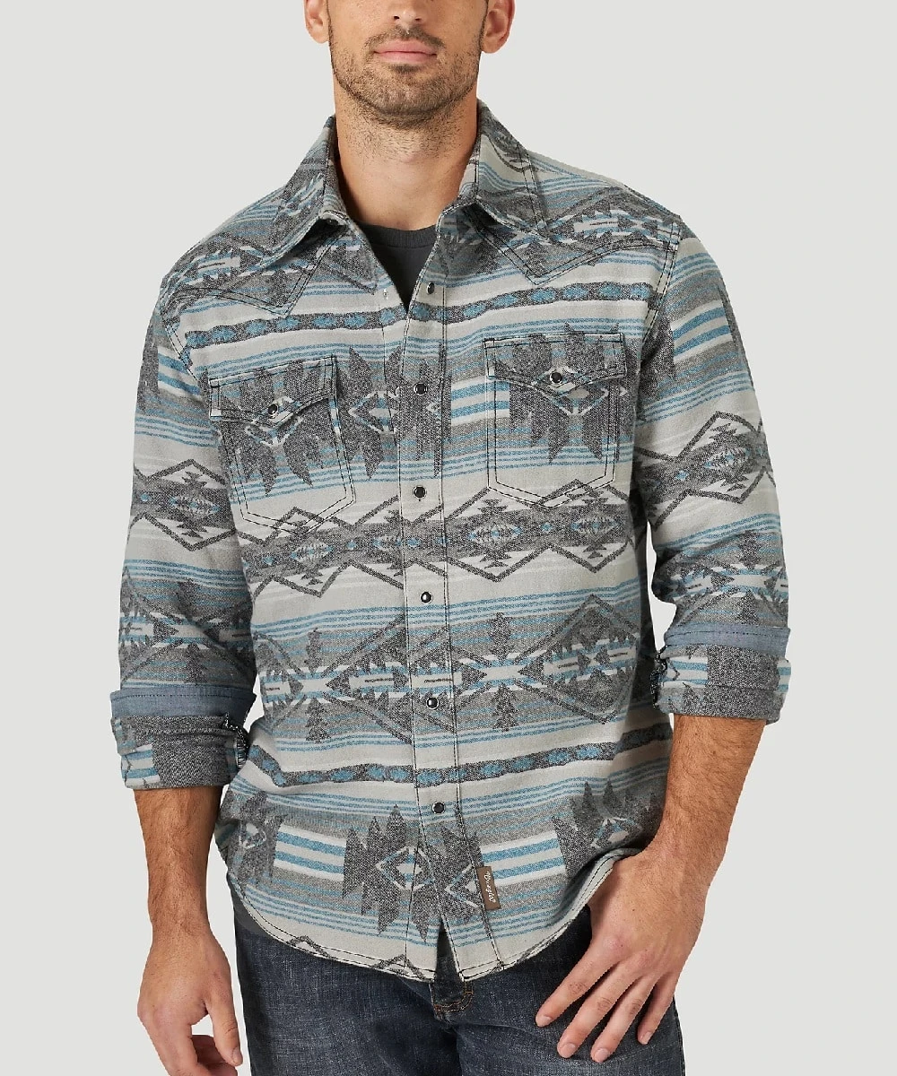100% Cotton; Slim Fit; Long Sleeve; Spread Collar; Black Snap Front And Cuffs; Two Single Point Snap Flap Chest Pockets; Single Point Front And Back Yokes; Grey And Turquoise Aztec Print; Color: Dark Shadow; Style #112318897