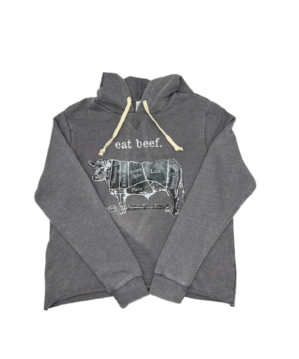 65% Cotton/35% Recycled Polyester; Long Sleeve; Drawstring Hood; Rib Knit Cuffs; Stitched Unfinished Waist; Front Black And White Graphic Cow Print; Color: Distressed Gray; Style #EAT BEEF XOXO